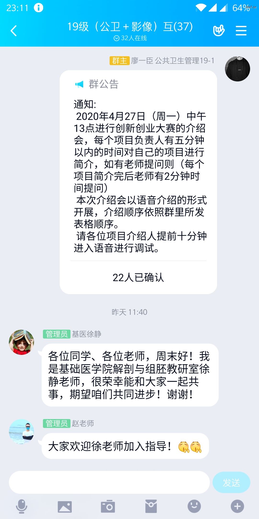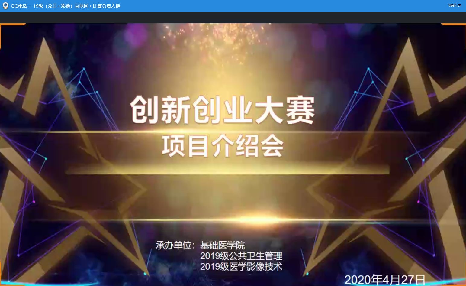 “百舸千帆敢闯新时代,起舞弄潮绘创世界梦”,为激发老员工的创造力,培养造就“雅职青年创业人”,能为社会创业人输入新鲜血液,按照今年老员工互联网+创新创业大赛赛程设置,太阳成集团tyc7111cc普专19级公共卫生管理专业和普专19级医学影像技术专业共计24个创新创业项目在辅导员赵武博的有序组织下于4月27日中午1点通过QQ群直播平台率先开展线上介绍会。太阳成集团tyc7111cc徐静、王贞和刘昌明作为结对指导老师全场参与本次介绍会,与各项目组同学积极交流互动。