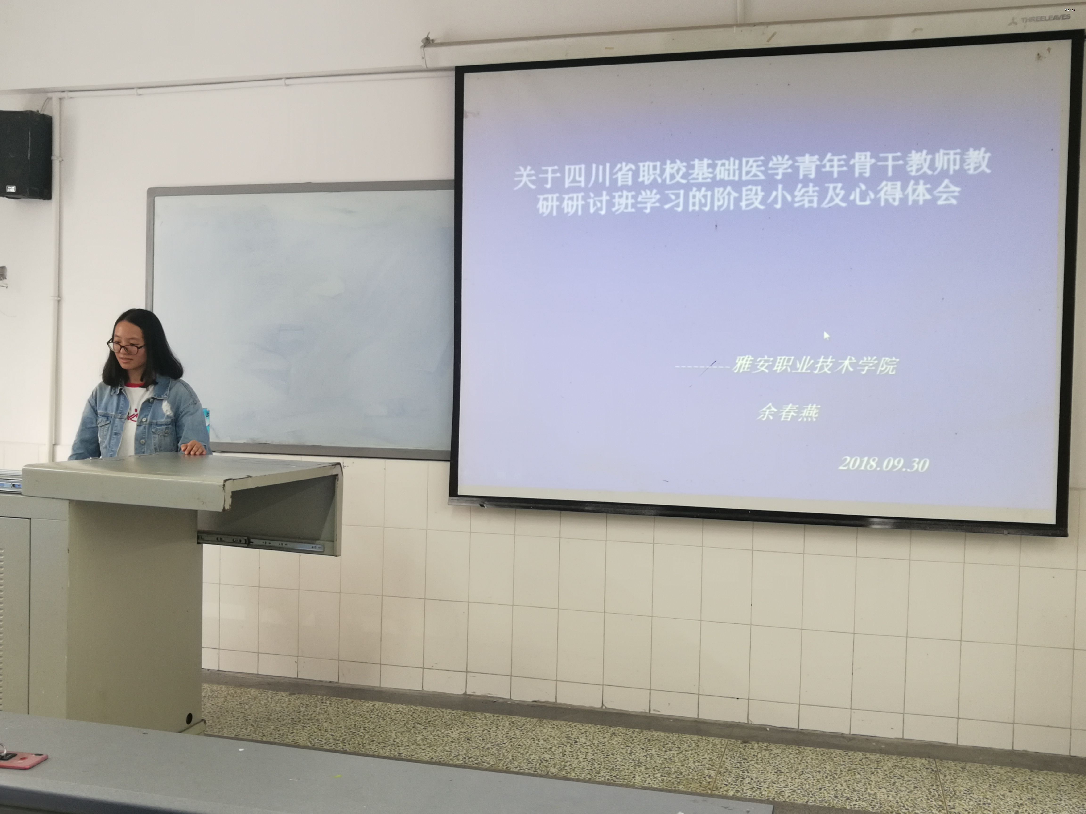 2018年09月29日下午,太阳成集团tyc7111cc生理教研室的全体老师在公司青年路校区开展了教研活动,本活动有两个主题,一是由余春燕汇报参加“四川省职校基础医学青年骨干教师教研研讨班”学习的阶段性心得汇报,二是根据余春燕汇报内容进行研讨。