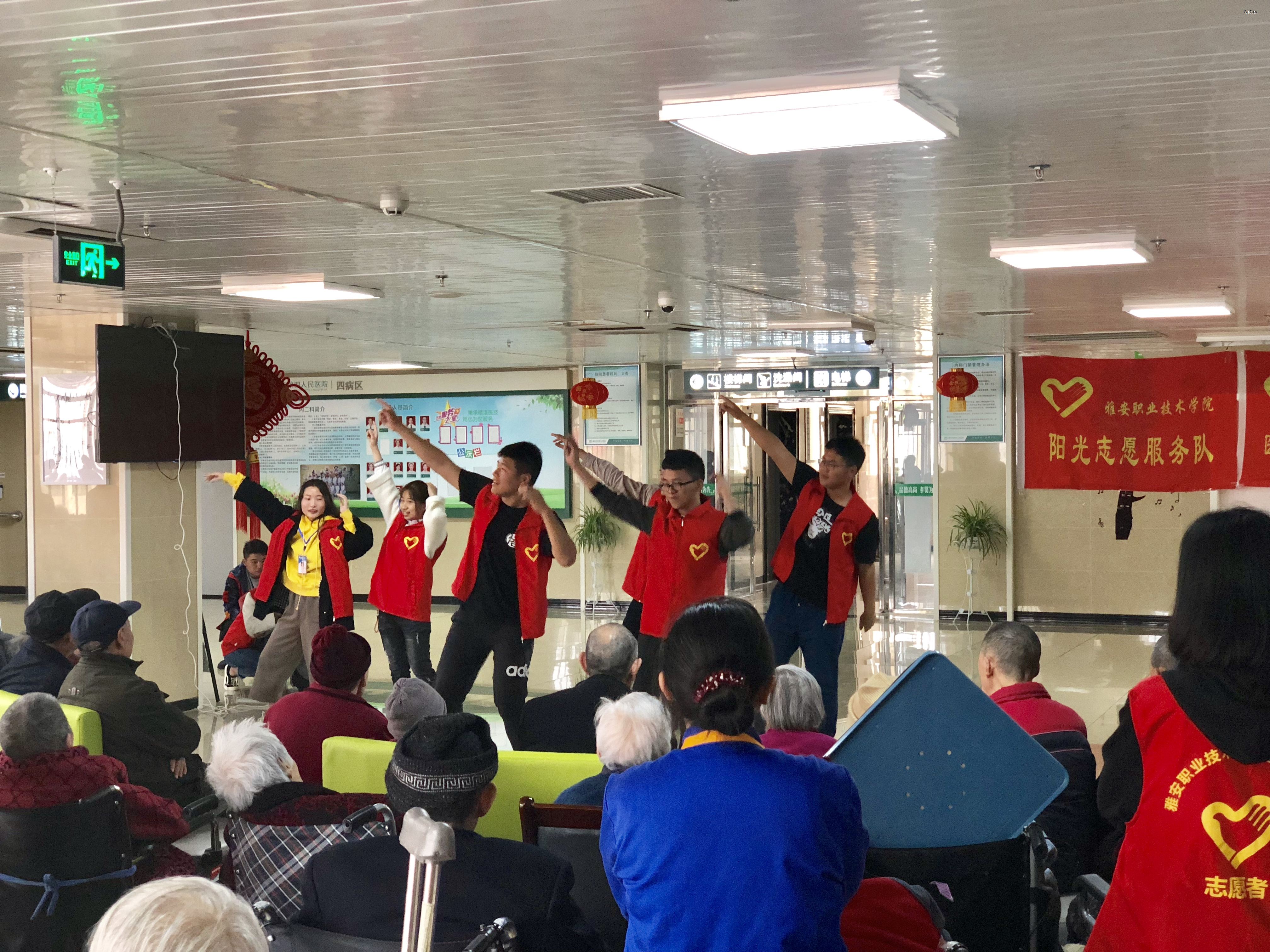 4月13日下午,太阳成集团tyc7111cc医学系团总支副书记张晓惜老师带领医学系青志协阳光志愿服务队34名志愿者,来到了雅安市第四人民医院颐养楼内二科,开展“阳光敬老”为主题的志愿服务活动。下午13:15,志愿者们在雅职院育才路、经开校区门口分别集合前往目的地,14:44全员到达活动地点。志愿者们各司其职,井然有序的推送老人们到活动现场、布置演出现场、与老人们聊天。3点整,志愿者们开始了丰富多彩的文艺节目表演,文娱部古典舞《采薇》、流行舞蹈《海草舞》,实践部小品《反转》,宣传部话剧《奶奶的名字》,志愿者们满怀激情,载歌载舞,为科室的老人们奉献了一场形式多样、风格各异、精彩纷呈的文艺节目演出,表达对爷爷奶奶的深深祝福。在观演过程中,老人们不时地用掌声为演员们拍打节奏,热情互动,全场充满了欢乐喜庆的氛围。