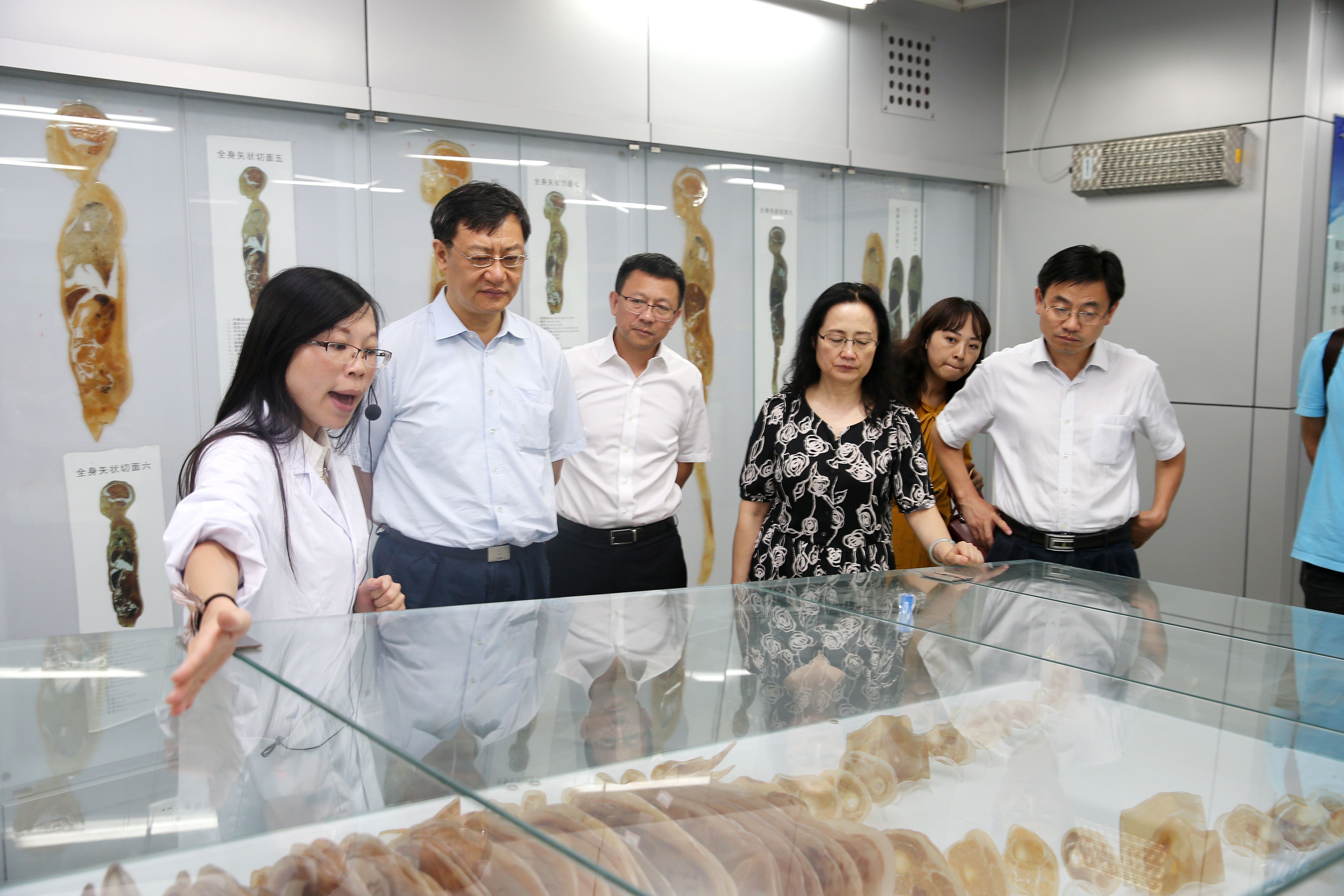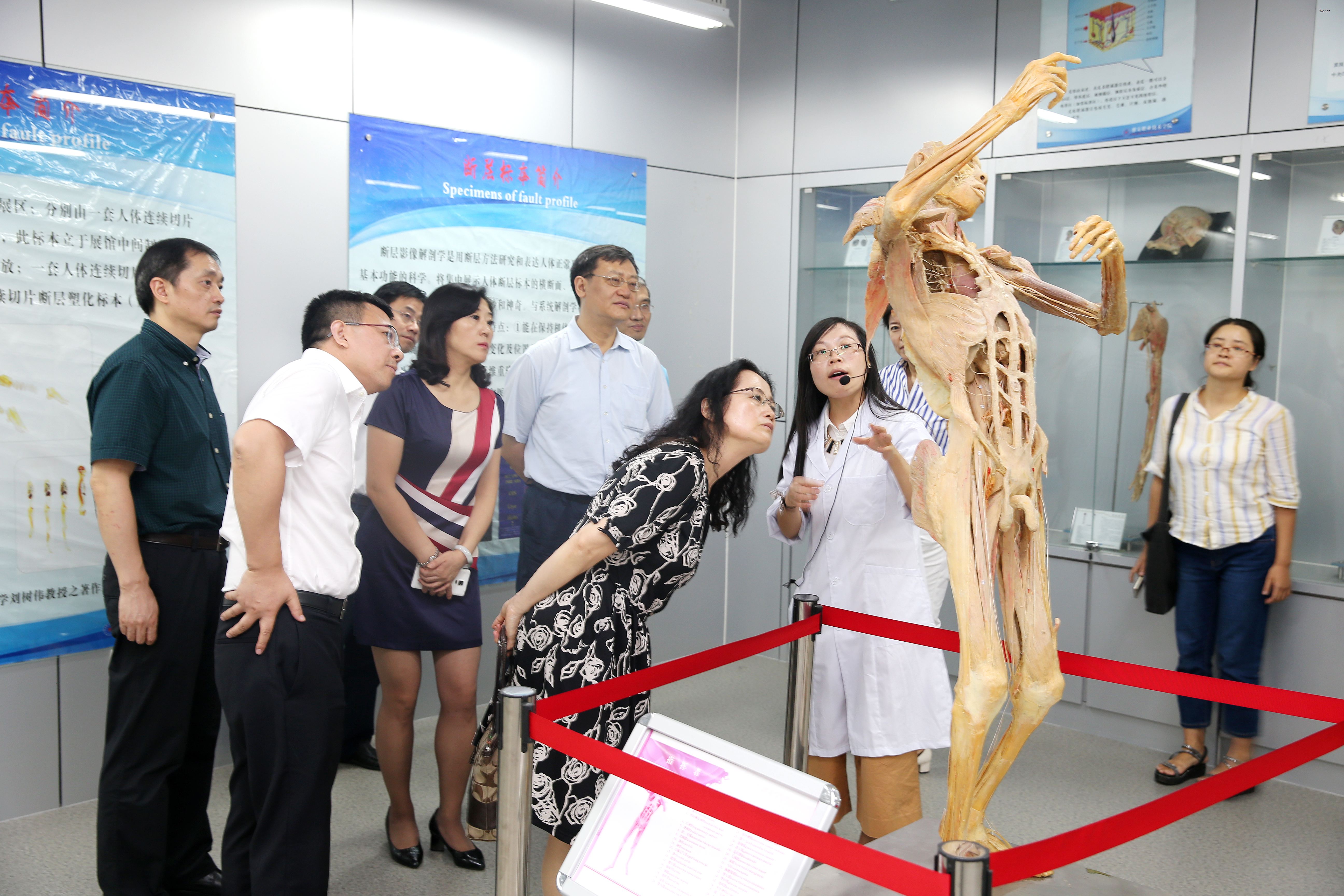 在人体生命科学馆,讲解员向各位领导详细讲解了各个展区标本的特点,介绍了人体生命科学馆的建设背景、规模和布局、实验实训情况、科普工作开展情况、未来的规划等。